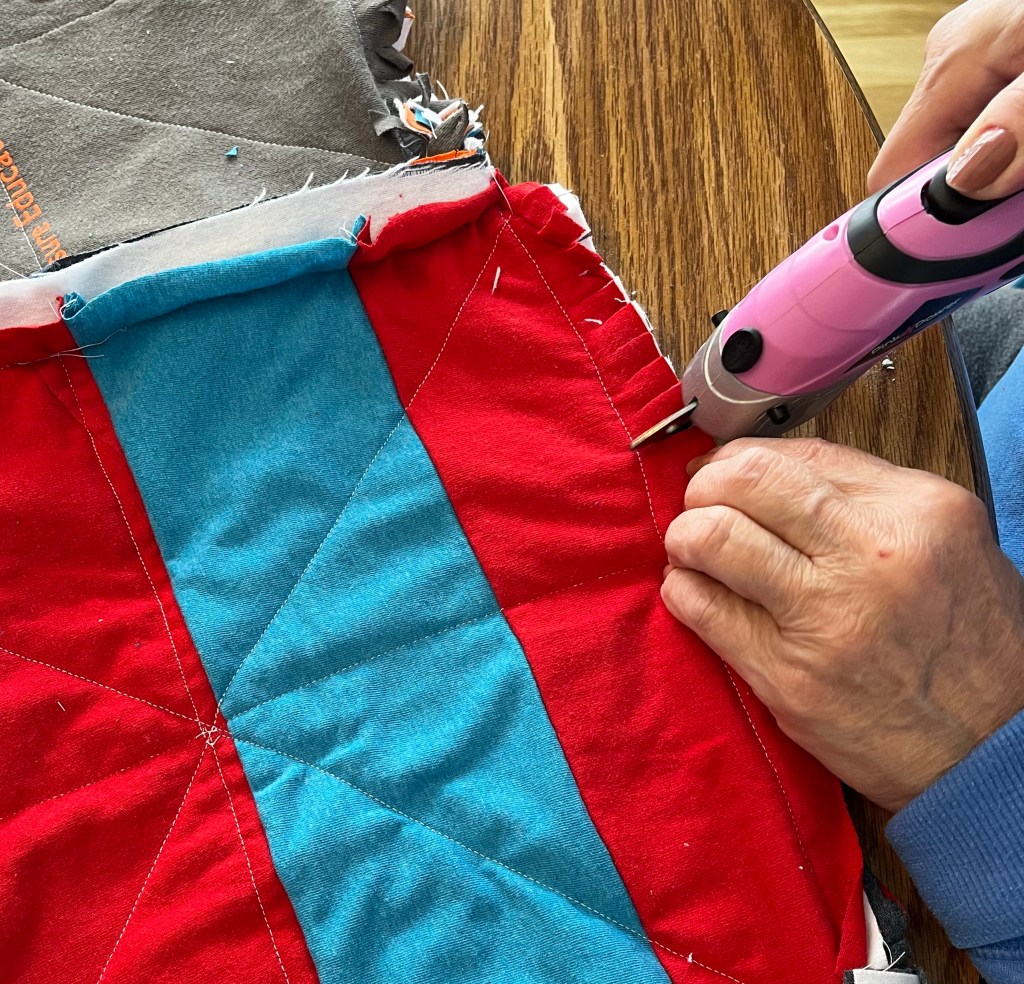 I took action with a new determination to self-regulate and limit my time to eliminate wear and tear on my hands and arms. I purchased an electric scissors (the idea popped into my head suddenly one day). This has proved to be a very real help to me. In the photo above I am using it on a rag style quilt with its endless snipping technique. The Holy Spirit had given me a direct answer.