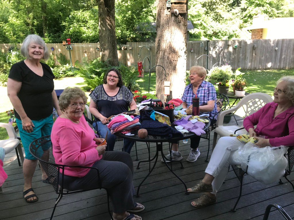 As it turned out, the stair lift ended up not being a fit for our basement steps. At that point we decided we would move our meetings upstairs around my dining room table, and Mary resumed attending. We had many happy times of fellowship around the table with its view of my garden and the bird feeder in the window. One Friday morning we enjoyed our time together around the picnic table on our back deck. What a precious time we had! It wasn’t God’s plan for Mary’s time in Crafters for Christ to end at that time. However, in August of 2022, the Lord called Mary “upstairs” to be with Him in heaven. How we miss her!