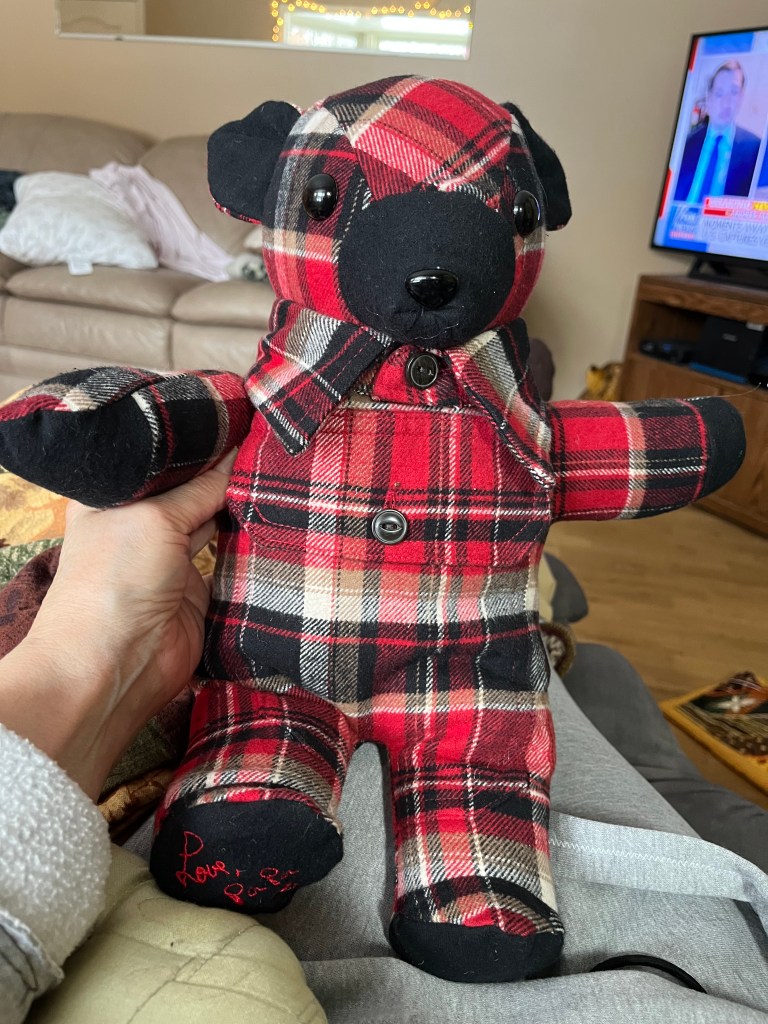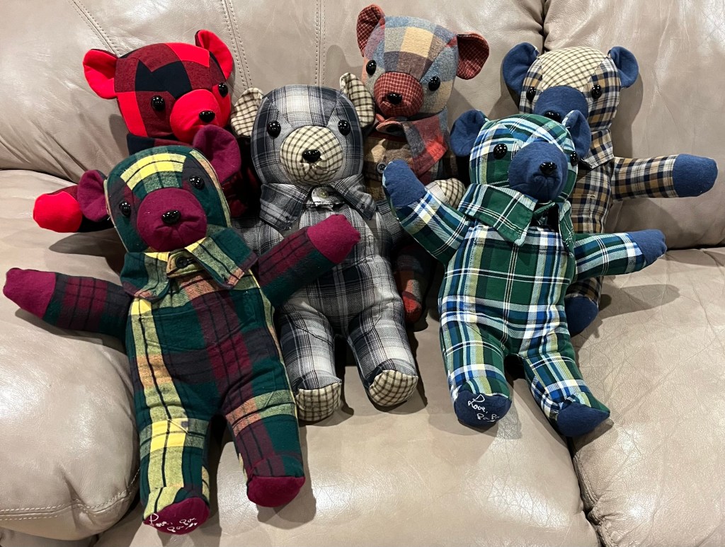 3 each of 16″ and 18″ bears with embroidered strap bags(extra)bears made from vintage 100% wool hunter clothing22 bears, all from a grandma’s clothing. All 16 inch, all with embroidery hearts.A new “Extra”: I designed little strap bags to hold voice recorders, from the cuffs of the shirtsMade from a sweaterGrandma Phyllis bearMade from sweatshirtsand sweatersMade from a knit sweaterMade from blanket flannelMade from shirts & pantsLuke Bear. Clothing $15 per piece.Luke Bear’s body was made from his T-Shirts, then dressed in his clothesLuke Bearback of Luke Bear hoodiesLuke Bear’s noses and paws were from his socks.“scrappy bear”Doc Bear from Grandpa’s suitcoatsDoc BearDoc BearSitting bear made from nursery curtainsGingham BearChristmas Bear with hand knit accessories18″ bear from t-shirt and sweater/sweatshirtExtras: shorts & shirtFlannel shirt bearsFleece makes great bears tooHazel, made from her dressesHazelExtra: added a portion of shoesGingham, made from curtainsmade from vintage quiltsadjusted a cap to fit the bearmade from a worn blanketmade from school uniformWeighted bearcotton ginghamfaux furmade from a sweatermade from khaki pants and plaid shirtmade from an Army shirtExtra: denim shorts voice recording inserted into back.Made from a newborn size sleeperHawaiian shirts make cute bearsFlannel shirts: always warm and softBaby Shower giftmade from a beautiful Pendleton wool shirtshirts, with embroidered extras3 bears from 1 shirtExtra camo shortsbear & dogMade from a heavy fleece lined jacket.This bear has a heart! Enclosed inside is a beautiful heart containing some of .the loved one’s ashes, attached to the black bow.Basic bears from jammies. Button placket extra.Basic Bears made of fleece. Hearts extra.
