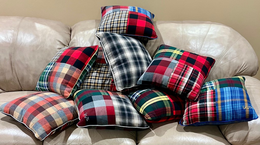 There are three styles of Memory Pillows which I currently offer (I am always open to new ideas also). All memory pillows include poem printed on card stock: “This is a shirt I used to wear; whenever you hold it, I am there” (or other words as you choose)